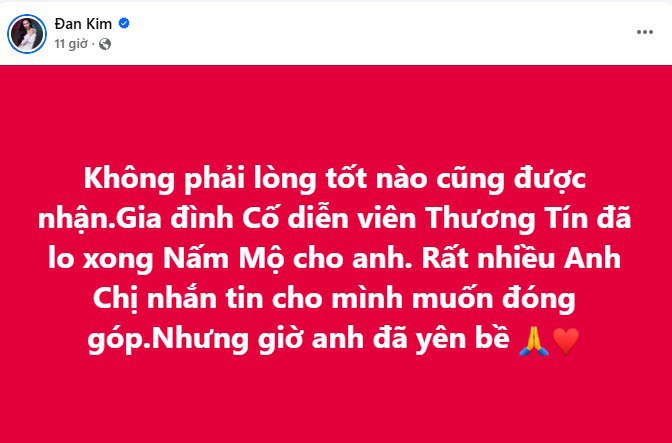 Ca sĩ Đan Kim cho biết, sau khi tìm cách liên hệ với gia đình cố diễn viên Thương Tín để bày tỏ ý định muốn được xây mộ cho ông nhưng gia đình đã xây xong mộ nên không nhận sự giúp đỡ này. Cô cũng cho biết, rất nhiều anh chị em ở hải ngoại, sau khi biết cô có ý định muốn xin phép gia đình xây mộ cho Thương Tín đã nhắn tin xin số tài khoản để đóng góp. Tuy nhiên, gia đình xin nhận tấm lòng, không nhận sự đóng góp.