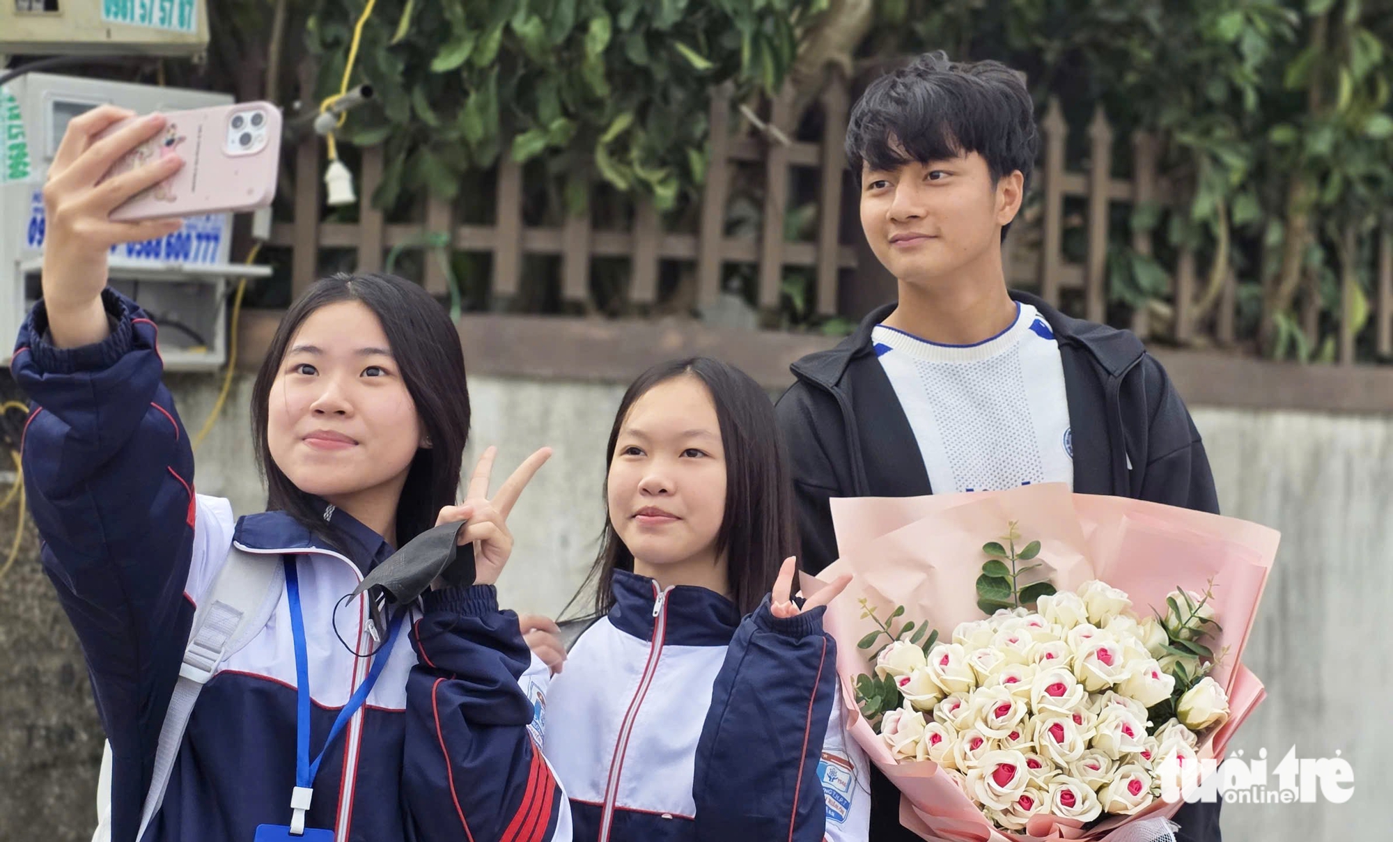 Các bạn học sinh chụp ảnh cùng thủ môn Cao Văn Bình ở quê nhà – Ảnh: DOÃN HÒA