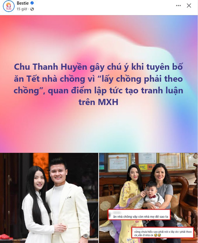 Giữa lúc chủ đề này được bàn luận sôi nổi, Chu Thanh Huyền đã thẳng thắn chia sẻ quan điểm cá nhân rằng cô sẽ ăn Tết nhà chồng, bởi theo cô, đã lấy chồng thì nên theo chồng. Trong bối cảnh Quang Hải phải thi đấu xuyên Tết, Chu Thanh Huyền cho biết cô sẽ vừa chăm con, vừa phụ giúp bố mẹ chồng chuẩn bị Tết.