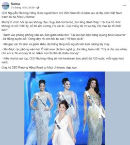 Trên các diễn đàn, một bộ phận cư dân mạng mỉa mai rằng Miss Universe ngày càng đặt nặng yếu tố tiền bạc, quyền lực và những thỏa thuận sau hậu trường hơn là giá trị sắc đẹp hay bản lĩnh của thí sinh. Sự hoài nghi càng tăng khi năm nay, nhiều khán giả tin rằng Hương Giang xứng đáng tiến sâu hơn, thậm chí nằm trong nhóm ứng viên mạnh nhất, nhưng cô lại sớm dừng chân trước Top 30. Một số ý kiến dành sự tiếc nuối cho đại diện Việt Nam, trong khi số khác chọn cách đùa vui bằng cách đề cử… bà Phương Hằng đi thi Miss Universe.